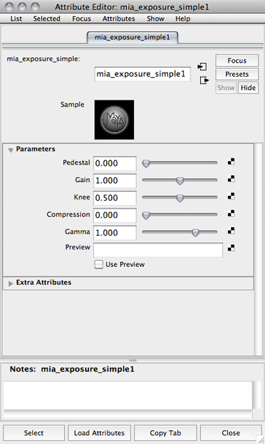 In this example, I will use the mia_simple_exposure lens shader (which is a simple tone mapping shader) for gamma correction. Map this shader onto the “lensh shader” attribute in the camera’s attribute editor under the “mental ray” section. There are five values here to review.