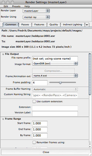 When you are ready to render out the image to disk, go back to the “mia_exposure_simple” lens shader settings and change the gamma value from 2.2 to 1. The reason for this is that we want to render out image in linear data – which means using a gamma correction of 1 – and keep the data handling throughout the process linear.
