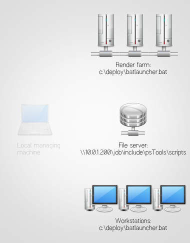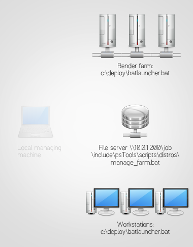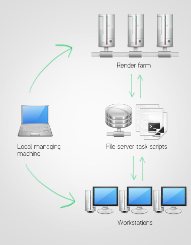 This is the main concept; from a local managing machine (such as a laptop), have workstations and farm machines run a remote script to carry out a task. Have a look at the diagram below: