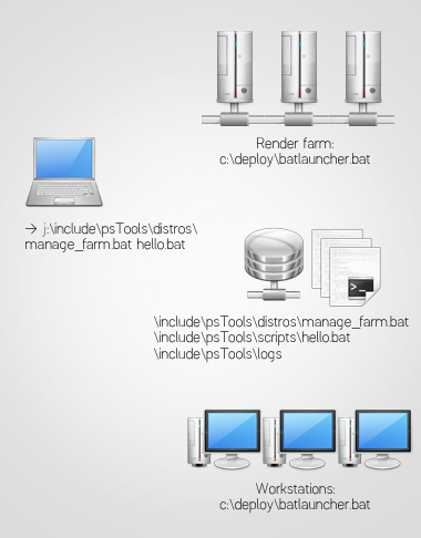 Let us place these two files in the same folder on the server, so that the manage_farm.bat script can be launched from any machine. I like this path: j:\include\psTools\distros for this example. Make sure you create the logs folder at j:\include\psTools\logs\ or you will receive errors that the log files cannot be written.