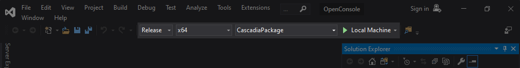 When the solution has been fully loaded, choose the following configuration dropdown menu values “Release”, “x64”, “CascadiaPackage” and click the “Local Machine” button. This will build, deploy and launch the terminal.
