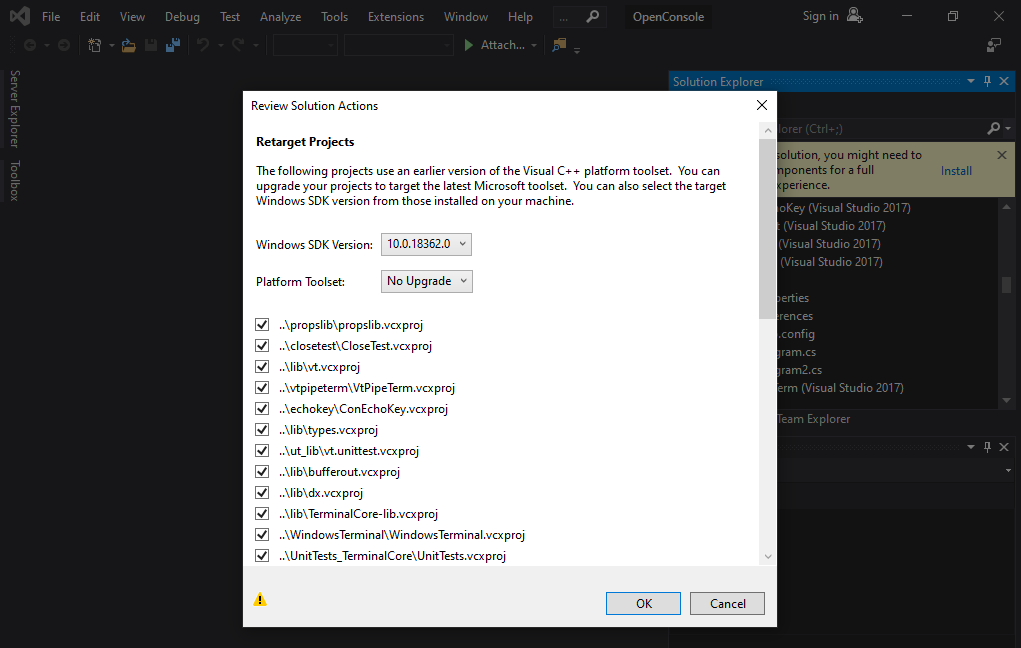 You will be prompted to upgrade the environment. In this dialog, choose to use Windows 10 SDK 10.0.18362.0, do not upgrade the Platform Toolset to v142 (meaning; keep using v141) and click “OK”, leaving all the remaining boxes ticked.